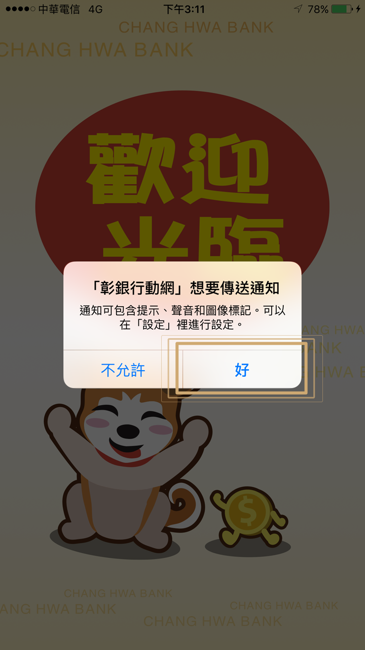 2. 首次開啟彰銀行動網App時,iPhone或iPad裝置要允許傳送通知