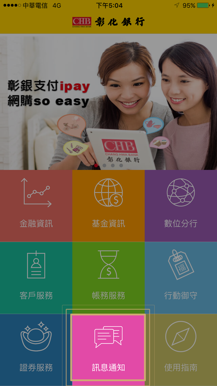 3. 在彰銀行動網Portal畫面點選【訊息通知】功能