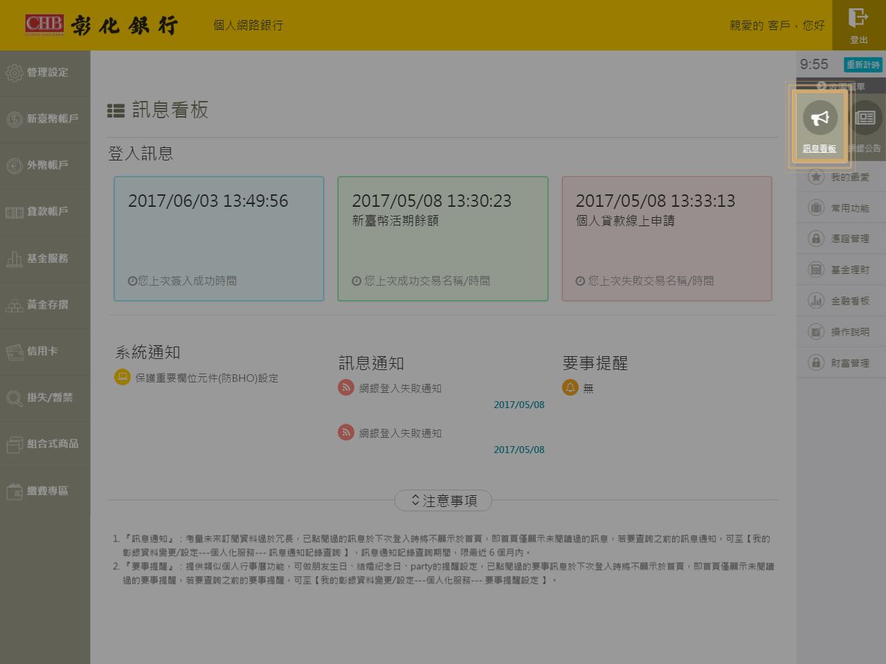 1.進入「訊息看板」功能,點選「系統通知」下的【保護重要欄位元件(防BHO)設定】功能